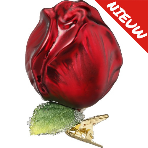 Deze prachtige rode roos zal een fleurige toets aan je kerstversiering geven. De roos staat nog in de knop en met de clip is bevestiging op een tak wel heel makkelijk. Materiaal: glas. Afmetingen: 6x4,5x4,5 cm