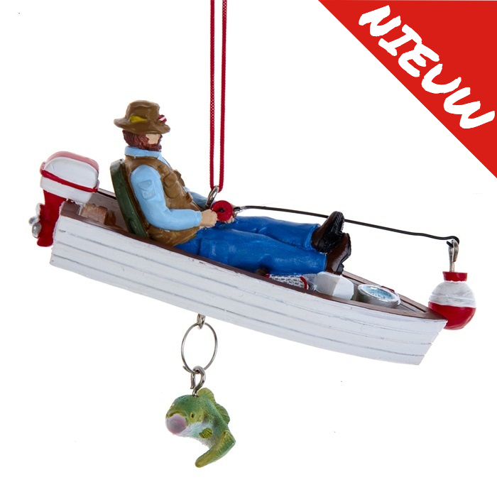 Deze kersthanger is echt iets om aan iemand te geven die er vaak met zijn bootje op uit trekt om te gaan vissen. De visser doet alsof hij op zijn hengel let maar is vast stiekem in slaap gevallen. Nou ja hij wordt wel wakker als er een dikke vis aan zijn lijn trekt. Deze mooie kersthanger zal bij iedereen die hem ziet een glimlach tevoorschijn toveren. Materiaal: resin. Afmetingen: 9,5x7x3,5 cm